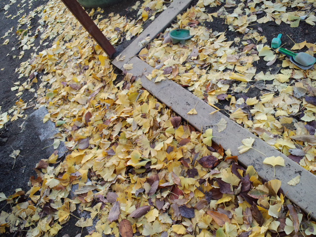 <昨日の雨でたくさん葉が落ちてしまいましたね。>