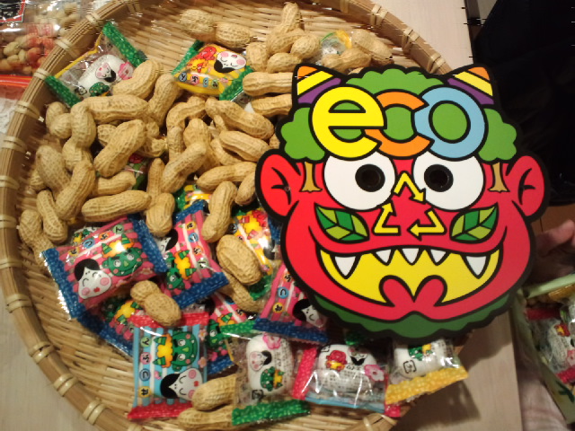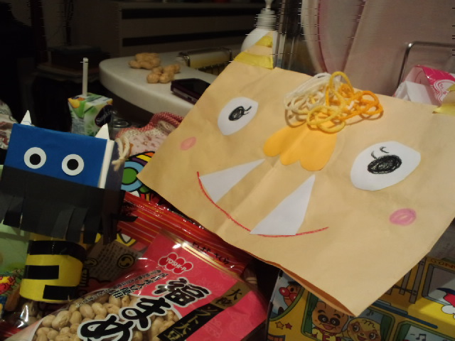 写真は、息子と娘が幼稚園で作ってきたさんぽうとお面。
