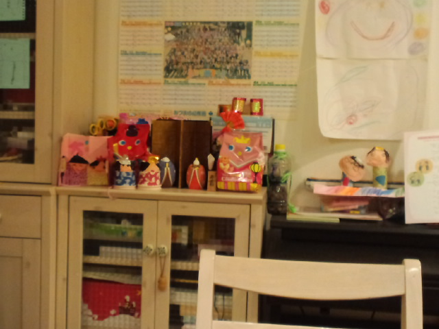 幼稚園で子供たちが作ってきたおひな様。