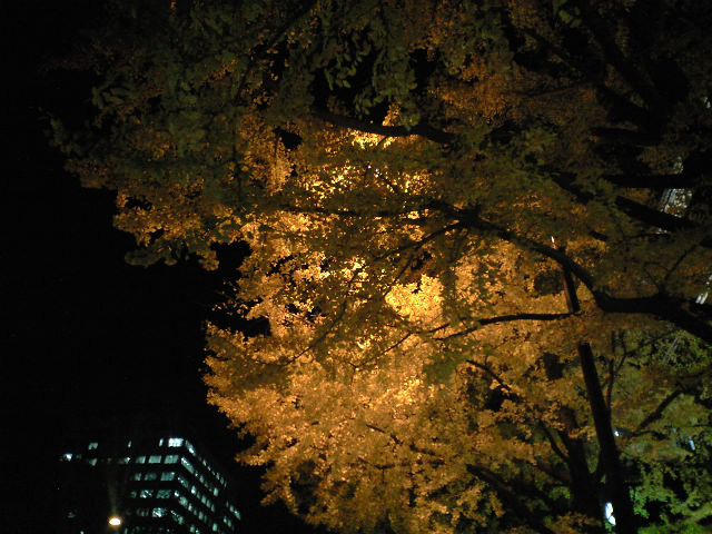 黄色に紅葉したイチョウの木と
