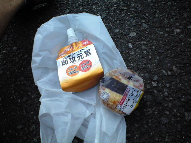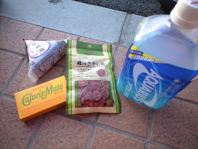 おにぎり、カロリーメイト、干し梅、アクエリアス。
